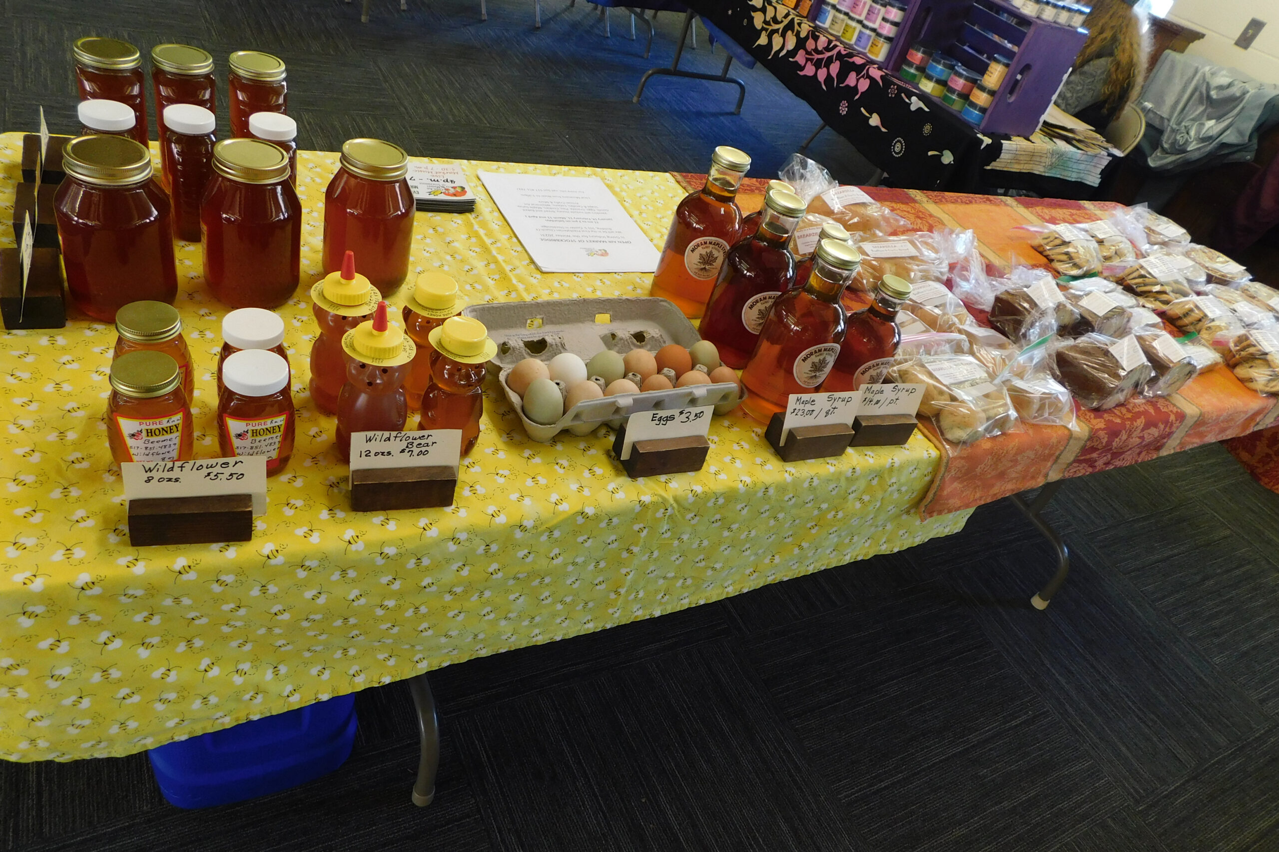 Items available this week include: honey, maple syrup, eggs, bread, granola, pies, cookies, baked goods, soaps, candles, lotions, art and dreamcatchers.