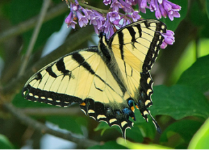 With tiger stripes and bright yelow wings, the tiger swallowtail is one of our prettiest butterflies. The male, like the one pictured here, has just a small patch of blue on his hind wings. The bottom wings have long “tails,” which reminded people of the forked tails of the swallow birds.