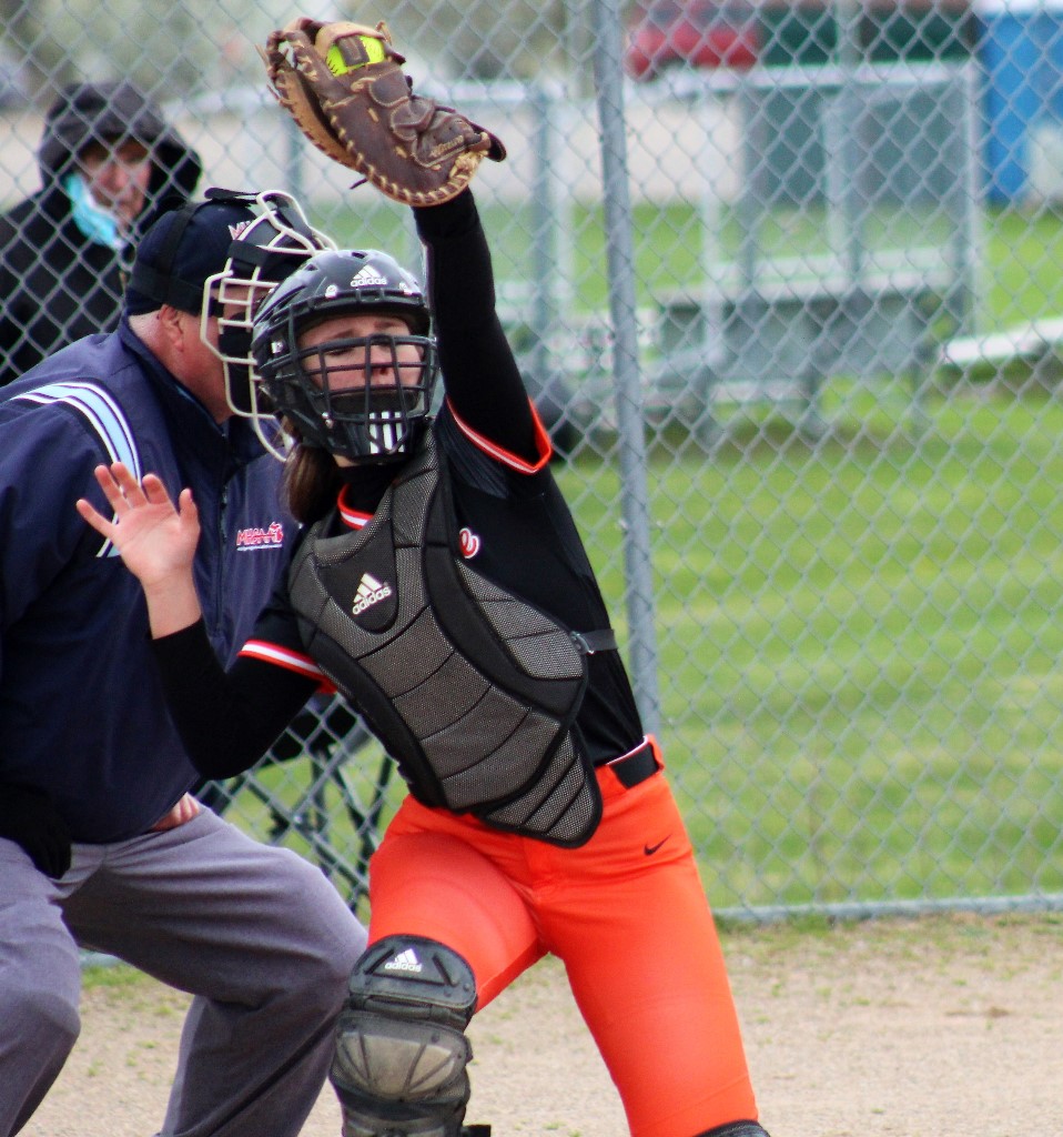 With one out in the seventh Leslie had a runner reach on a passed ball on a third strike. With two outs Leslie got a base hit to center, and the Blackhawks sent the runner home to try to score, McKenzie Noble fired the ball home to Caskey who fired to third as the runner tried to get back to the base and Makayla Surline put the tag on her to end the game.