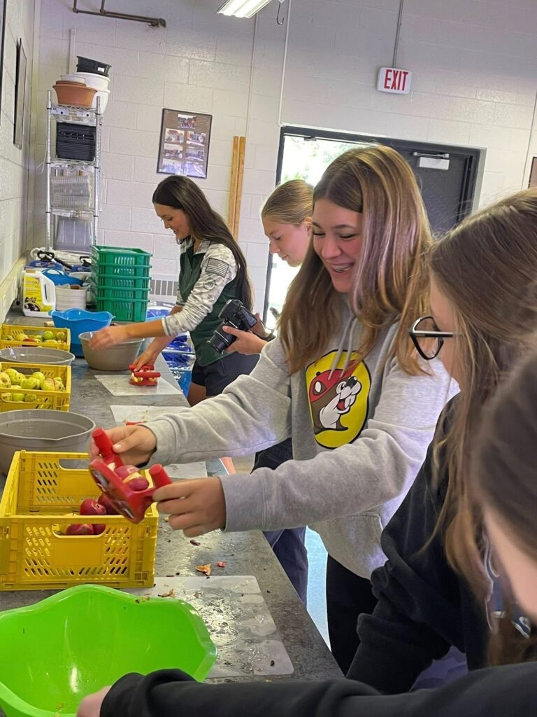 FFA and agriculture students in grades 7–12 partnered with Heritage Elementary’s 5th graders to make apple cider using six bushels of apples from the school orchard. This hands-on project connected students of all ages to the process of food production.