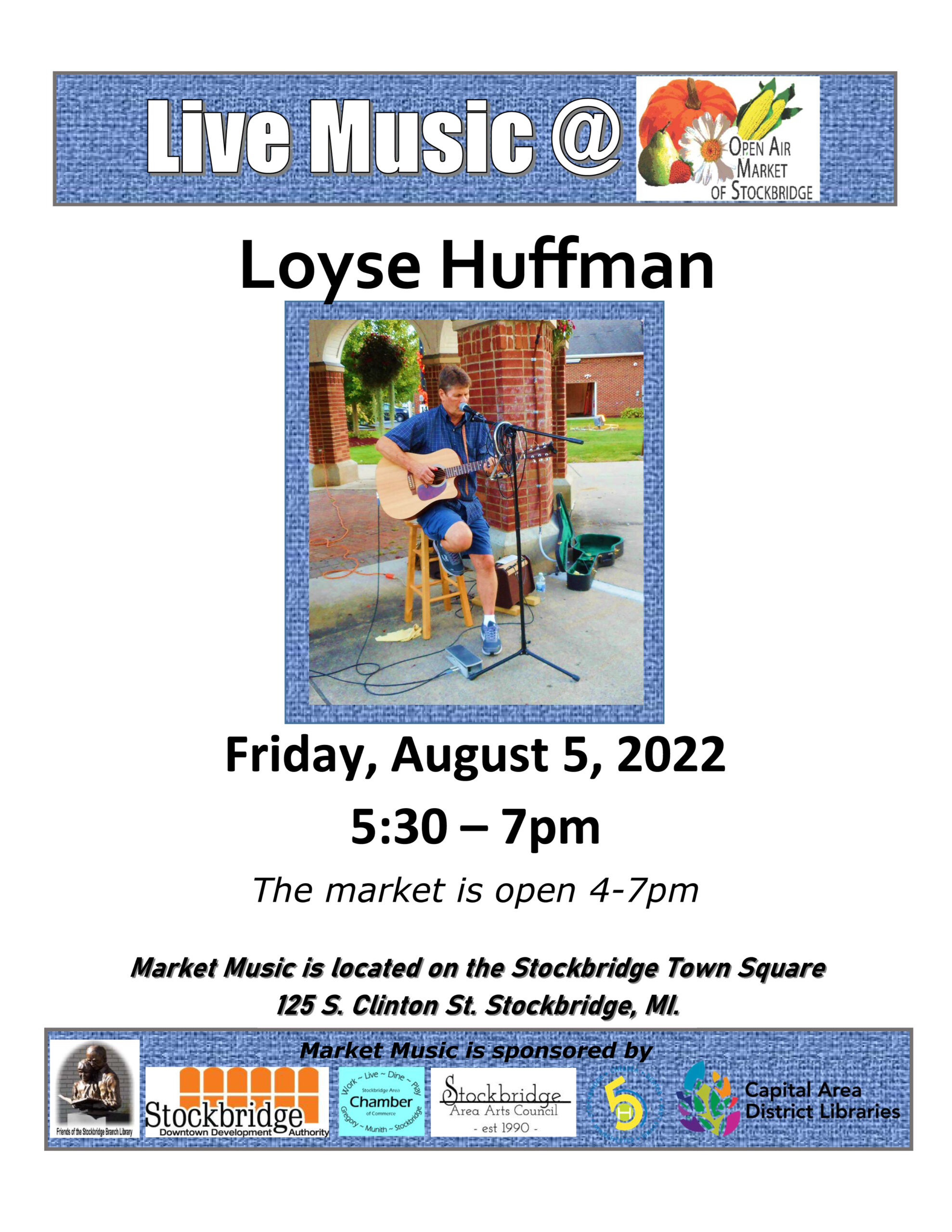 Market Music is from 5:30 to 7 pm featuring sweet music by Loyse Huffman.